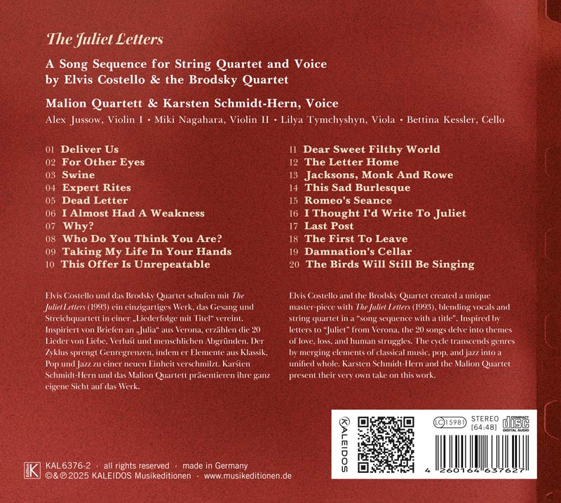 Der Singer/Songwriter Elvis Costello und das britische Brodsky Quartet schufen mit The Juliet Letters (1993) ein einzigartiges Werk, das Gesang und Streichquartett in einer „Liederfolge mit Titel“ vereint. Inspiriert von Briefen an „Julia“ aus Verona, erzählen die 20 Lieder von Liebe, Verlust und menschlichen Abgründen. Der Zyklus sprengt Genregrenzen, indem er Elemente aus Klassik, Pop und Jazz zu einer neuen Einheit verschmilzt. Karsten Schmidt-Hern und das Malion Quartett präsentieren ihre ganz eigene Sicht auf das Werk.