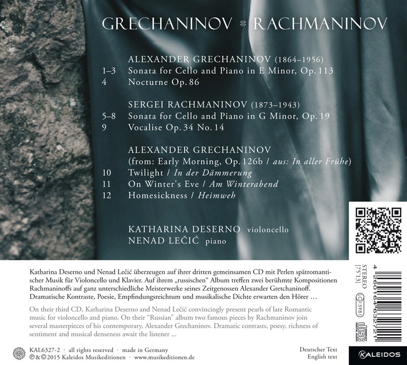 Auf diesem Album des Kammermusikduos Katharina Deserno / Nenad Lečić treffen zwei berühmte Kompositionen Rachmaninovs (Cello-Sonate op.19 und Vocalise op.34) auf ganz unterschiedliche Meisterwerke seines Zeitgenossen Alexander Grechaninov: Seine Cellosonate op.113 zeigt ihn als erfindungsreichen Melodiker und Dramatiker, dessen Stil zwar nicht mit romantischen Konventionen des 19. Jahrhunderts bricht, der aber in diesem Werk gleichwohl bestrebt ist, die Sonatenform originell auszufüllen.
