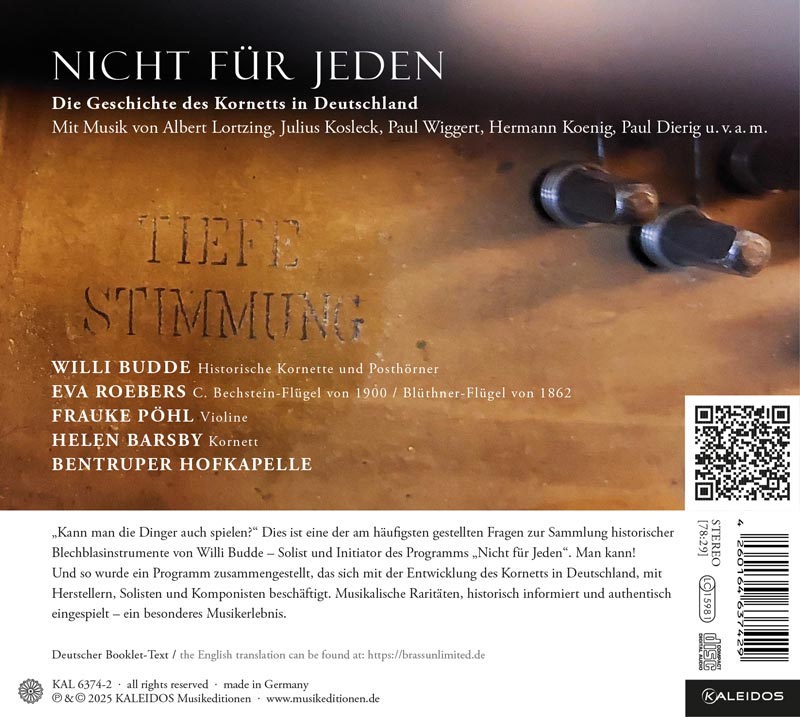Die vorliegende CD gibt einen Einblick in die Vielfalt und den Erfindungsreichtum, mit dem die Kornettfamilie immer wieder erweitert wurde, mit besonderem Augenmerk auf Deutschland, ein Thema, das bisher kaum Beachtung gefunden hat. Kornette waren damals nicht nur, wie heute üblich, in B gestimmt. Es kommen auch Kornette in C, in Es, in A und in As zum Einsatz, ganz so, wie es im 19. Jahrhundert üblich war. Die Orchesterstimmung lag damals bei A=430 Hertz, der Blüthner-Flügel von 1862 ist in A=432 Hertz und der Bechstein-Flügel von 1900 in A=440 Hertz gestimmt.