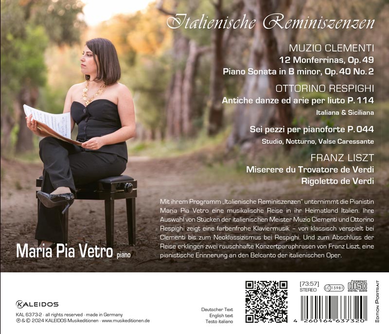 Mit ihrem Programm „Italienische Reminiszenzen“ unternimmt die Pianistin Maria Pia Vetro eine musikalische Reise in ihr Heimatland Italien. Ihre Auswahl von Stücken der italienischen Meister Muzio Clementi und Ottorino Respighi zeigt eine farbenfrohe Klaviermusik – von klassisch verspielt bei Clementi bis zum Neoklassizismus bei Respighi. Und zum Abschluss der Reise erklingen zwei rauschhafte Konzertparaphrasen von Franz Liszt, eine pianistische Erinnerung an den Belcanto der italienischen Oper.