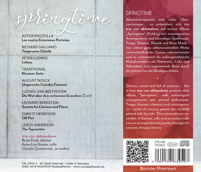 Abwechslungsreich und voller Überraschungen…  so präsentiert sich das trio con abbandono auf seinem Album SPRINGTIME mit extravaganten Arrangements und lebendiger Spielfreude. Den musikalischen Rahmen zu dieser Klangreise durch die Musikgenres bildet der Tango Nuevo mit Astor Piazzollas „Jahreszeiten“ und Richard Gallianos „Tango pour Claude“. Mit ihrem eigenwilligen Arrangement des berühmten Zyklus von Piazzolla erweckt das Trio eine neue interessante Begegnung zweier Komponisten (Vivaldi und Piazzolla) zum Leben – vom Barockzeitalter in die Gegenwart, von Europa nach Südamerika. „Jede Art von Musik, die musikalischer Ausdruck ist, hat für mich Gültigkeit“. Dieses Zitat von Leonard Bernstein gilt dem Trio als Motto für ihre Einspielung unterschiedlichster Werke aus verschiedenen Genres. Und so unternehmen die Musikerinnen eine spannende Reise durch die „Jahreszeiten“ der Musikgeschichte: Portugiesischer Weltschmerz (Saudade) zieht mit Peter Ludwigs „Lisboa“ ein und mit ihrem eigenen Arrangement einer Klezmer-Suite zeigt das Trio seine Neigung zur folkloristischen Musik. Im Duo Klarinette/Cello und Klarinette/Akkordeon treten sie solistisch in zwei technisch herausfordernden Kompositionen moderner Kammermusik hervor. In Svante Henrysons „Off Pist“ schlägt die Klarinette, angetrieben vom rockig angehauchten, drängenden Rhythmus des Cello, mitreißende Kapriolen. In Bernsteins „Sonata for Clarinet and Piano“, die er selbst für sein erstes reifes Werk hielt, erweisen Sie dem Komponisten zum 100. Geburtstag 2018 ihre Referenz. Und wenn sich das Trio mit Beethoven auf die Suche nach dem verlorenen Groschen (Cent) macht, setzt ein facettenreiches Arrangement mit überraschenden Musikzitaten witzig-humorvolle Akzente. Quasi als „Zugabe“ interpretiert das Ensemble den berühmten „Typewriter“ von Leroy Anderson. Hier kommt auch eine echte Schreibmaschine zum Einsatz, unterstützt vom Registerklappern des Akkordeons.